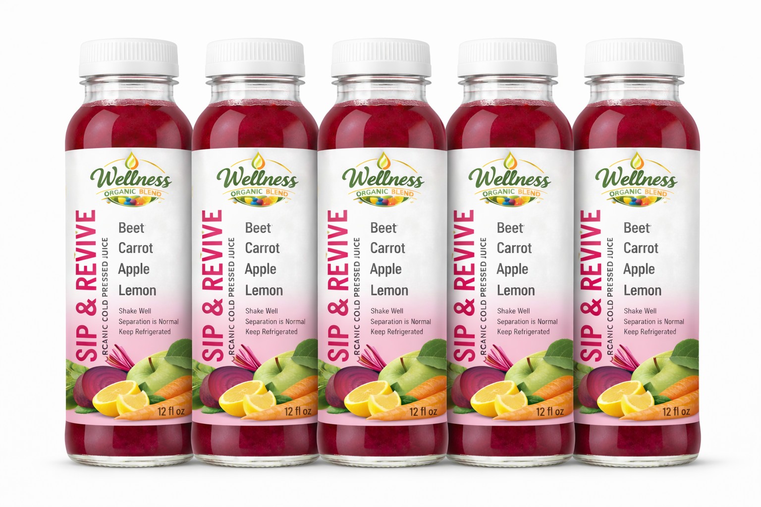 Enjoy five (5) 12 oz cold-pressed Sip & Revive juices, crafted with fresh organic fruits and vegetables. Smooth, refreshing, and uplifting. Made with beet, carrot, green apple, and pineapple.