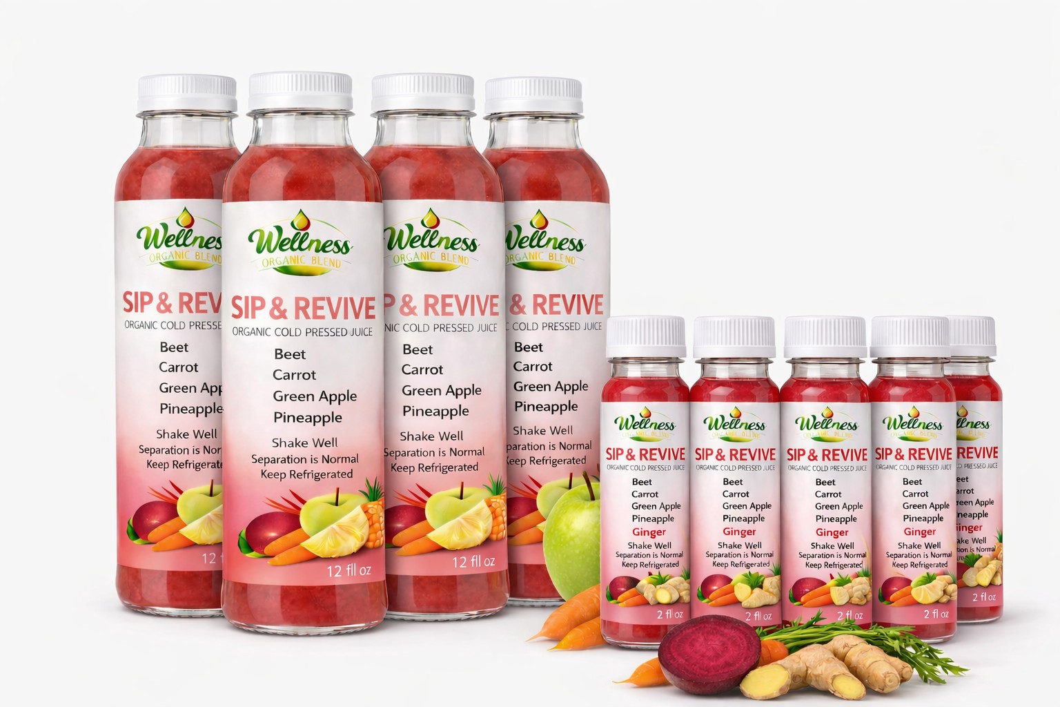 Enjoy a refreshing bundle that includes 4 Sip & Revive cold-pressed juices (12 fl oz each) and 5 Sip & Revive wellness shots (2 fl oz each). This vibrant blend is made with beet, carrot, green apple, pineapple, and ginger for a naturally bold and refreshing taste.